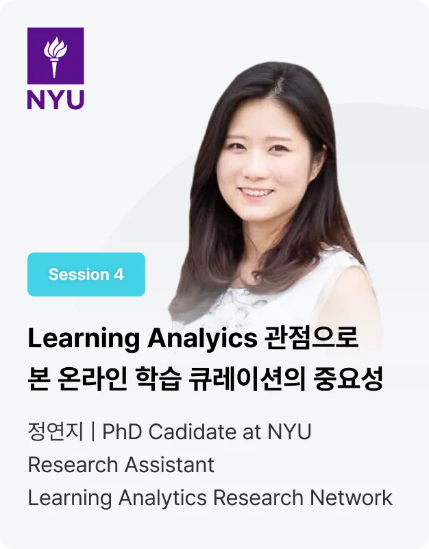 정연지 , PhD Candidate Research Assistant, NYU Learning Analytics Research Network15:50 ~ 16:20Session 4Learning Analytics 관점으로 본 온라인 학습 큐레이션의 중요성