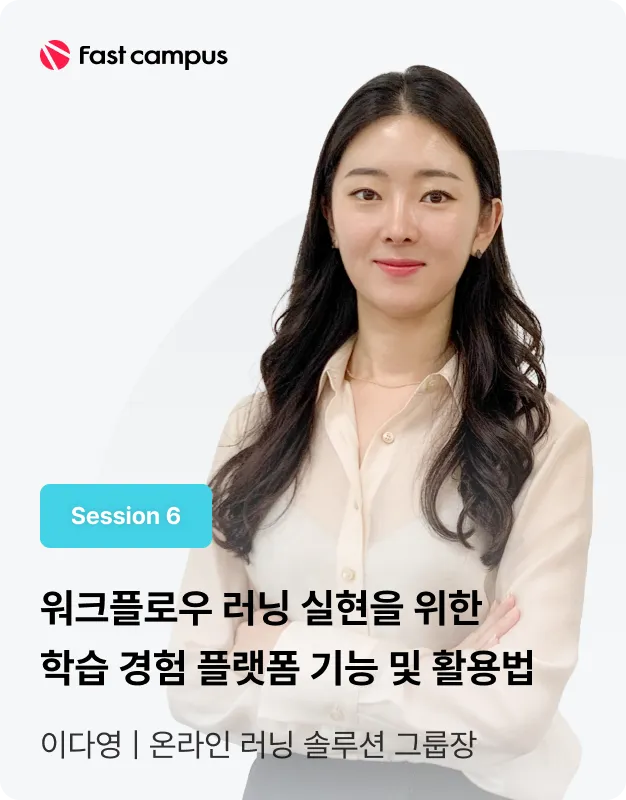 이다영 온라인 러닝 솔루션 그룹장, Fast campus16:40 ~ 17:00Session 6워크플로우 러닝 실현을 위한 학습 경험 플랫폼 기능 및 활용법