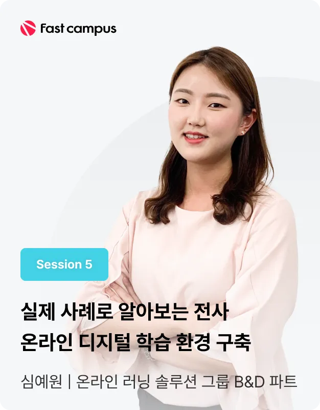 심예원 매니저, 온라인 러닝 솔루션 그룹 Business Development 파트, Fast campus16:20 ~ 16:40Session 5실제 사례로 알아보는 전사 온라인 디지털 학습 환경 구축