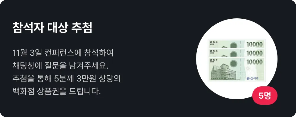 * 사전 등록자분들께는 별도로 컨퍼런스 참석 방법을 안내해드립니다. (※ 사전 등록시, 기재한 연락처로 안내되오니 정확한 정보 기재 부탁드립니다.)