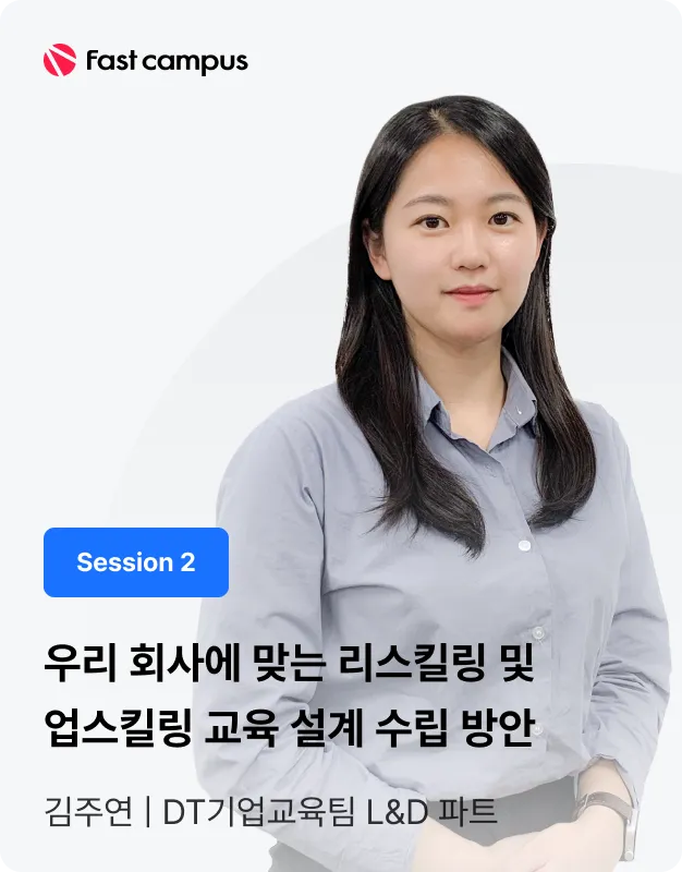 김주연 매니저, DT기업교육팀 L&D 파트, Fast campus15:10 ~ 15:30Session 2우리 회사에 맞는 리스킬링 및 업스킬링 교육 설계 수립 방안