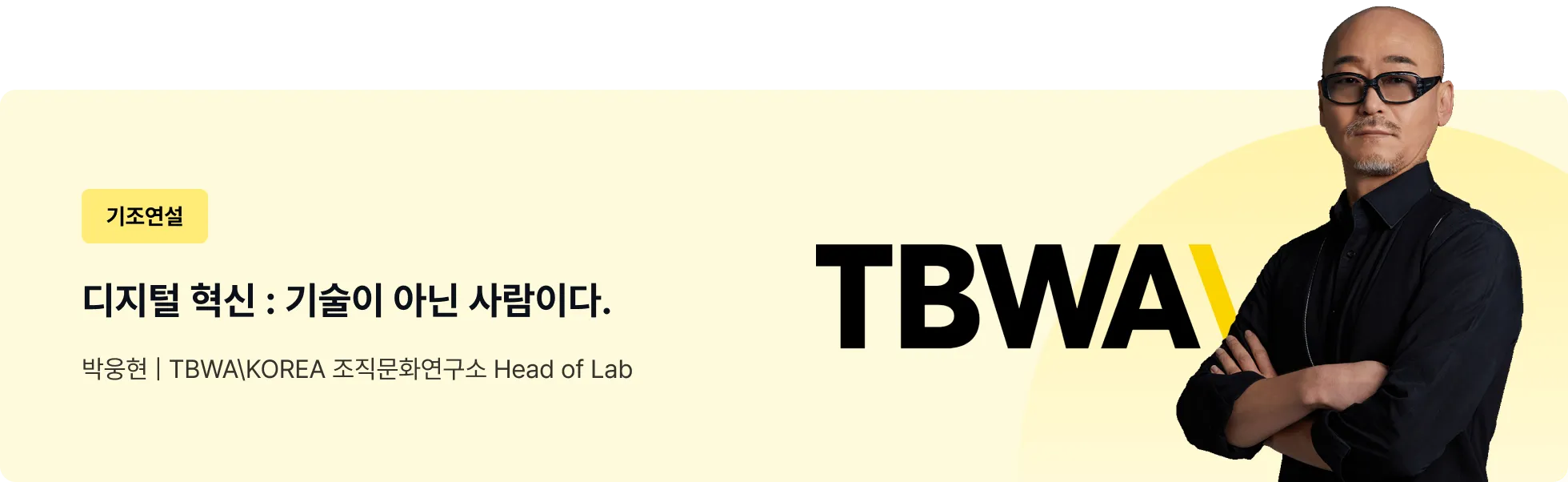 박웅현 Head of Lab, TBWA\KOREA 조직문화연구소14 : 10 ~ 14 : 40기조 연설디지털 혁신 : 기술이 아니라 '사람'이다.