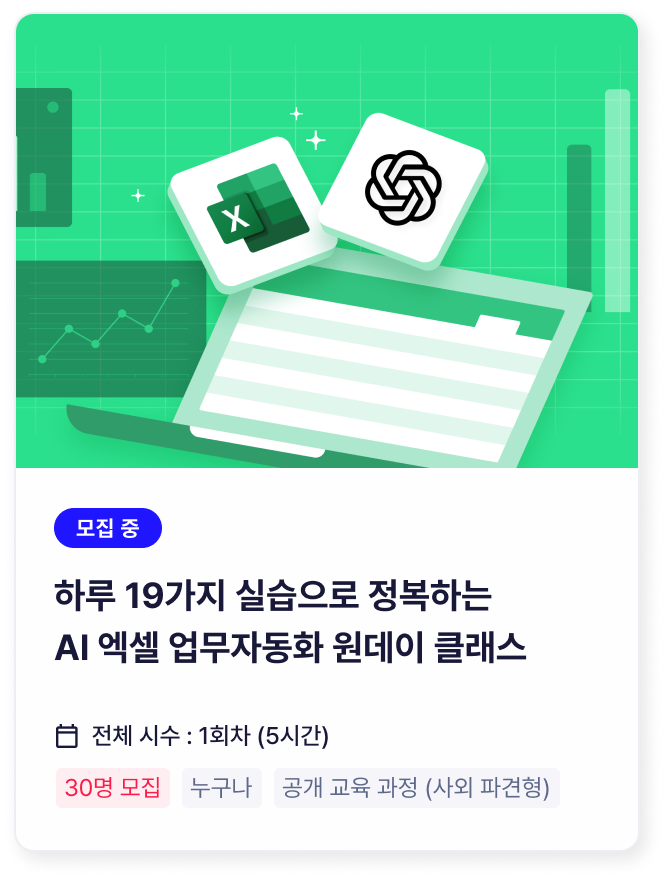 하루만에 활용 실습 결과물까지직무별로, 부서별로 생성형 AI를 활용하는 방법은 달라집니다. ChatGPT를 활용해 실제로 회사에서 하는 업무를 효율적으로 바꾸는 방법을 배웁니다. -