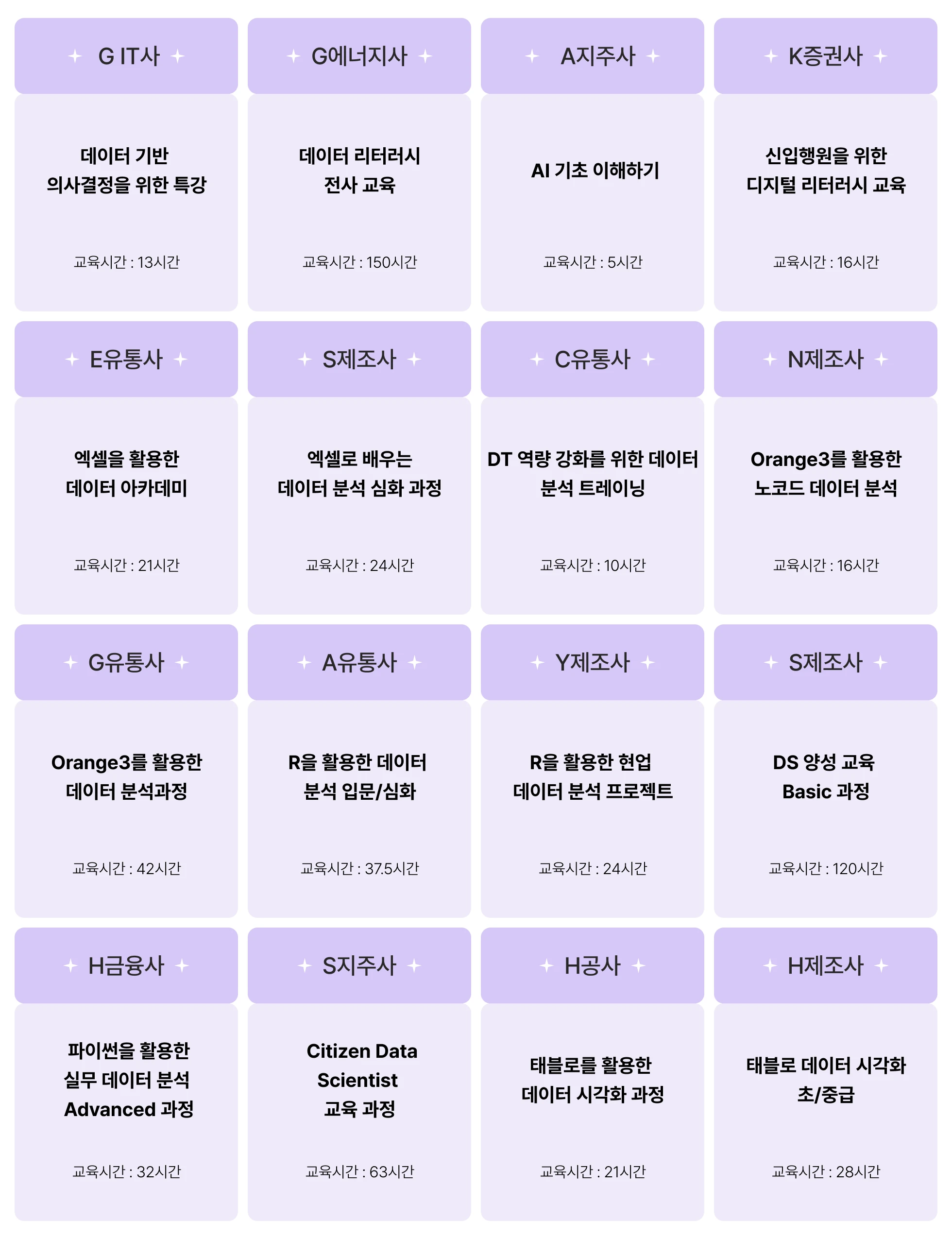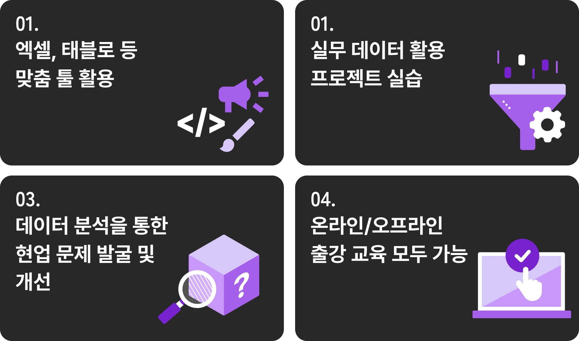 오늘 배워 내일 적용할 수 있는 데이터 실무 교육이 가능합니다.