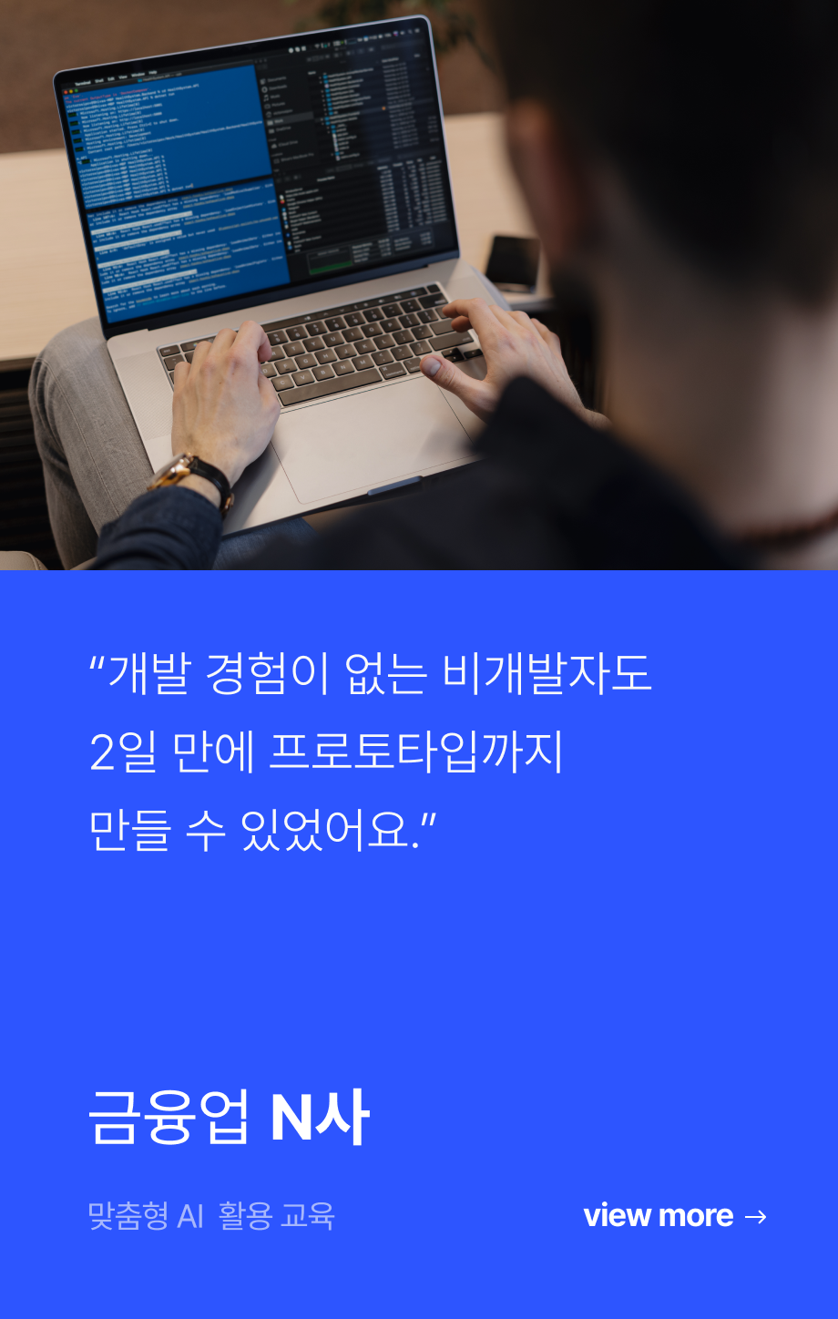 N사는 AI 기반의 일하는 방식이 단기간의 혁신으로 끝나지 않고, 전사적으로 ‘새로운 표준’이 될 것이라 판단했습니다. 특히, 비 IT 직군의 디지털 이해도 제고와 IT 직군의 전문성 강화를 동시에 해결할 수 있는 전사 교육이 필요하다고 보았습니다.
