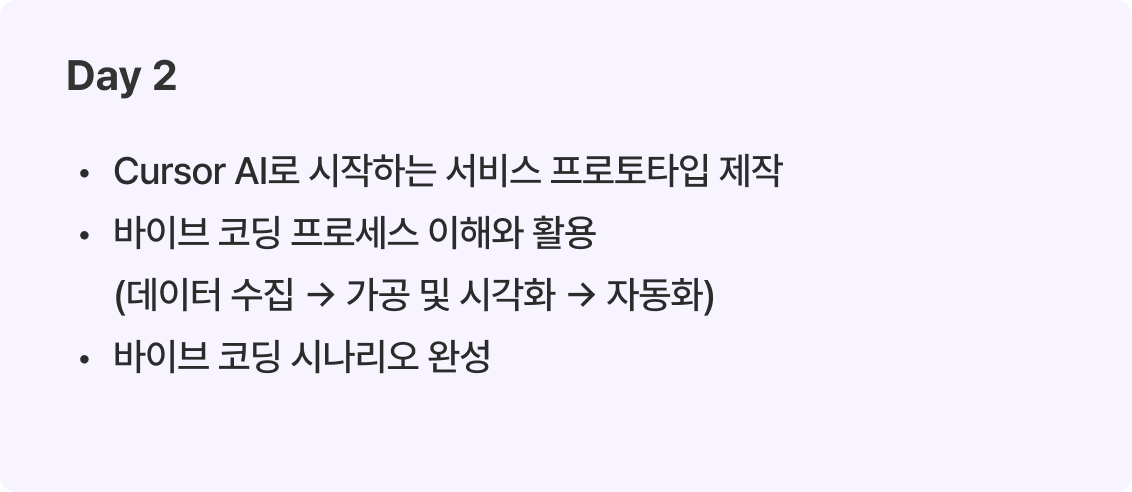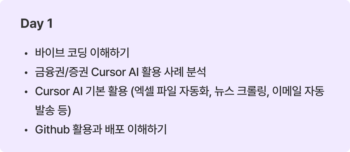 이번 과정은 Cursor AI를 체험해 보는 것에서 그치지 않고, 업무 맥락에 맞는 자동화 기능을 직접 구현해 보는 구조로 구성했습니다. 총 2일, 14시간 동안 진행된 교육은 ‘강의 → 실습 → 피드백’ 흐름으로 구성해 몰입도를 높였고, 다음과 같은 커리큘럼을 통해 자연스럽게 AI 개발 프로세스를 습득할 수 있도록 했습니다.