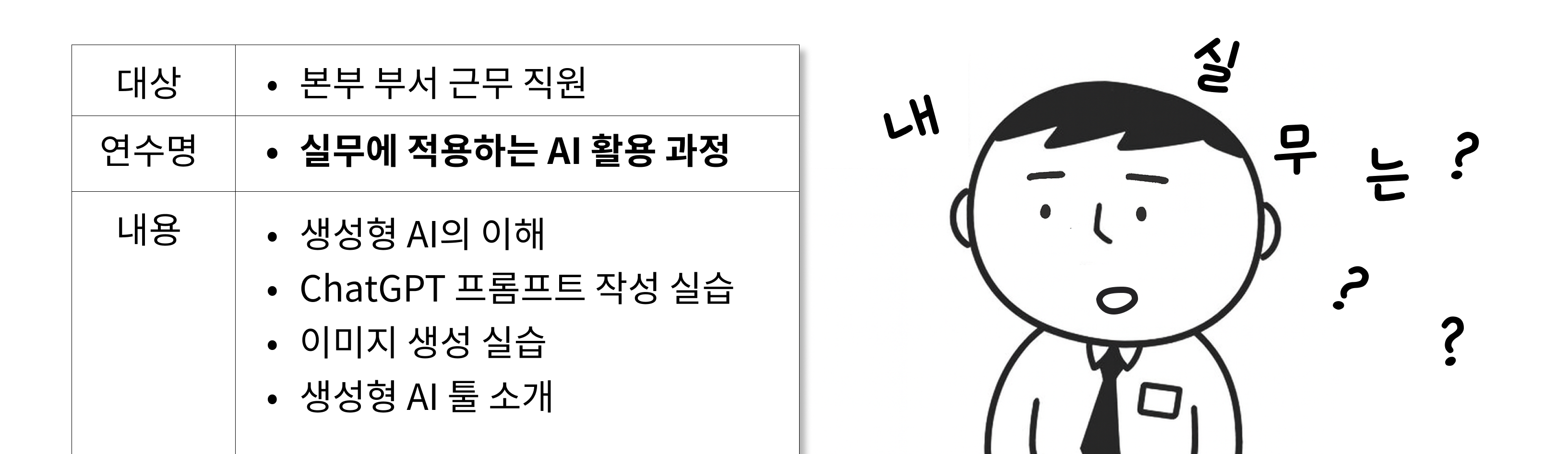 과정명에는 "실무"에 바로 적용할 수 있다고 되어있었지만, 실제 교육 내용은 너무 원론적이었습니다. 제가 진짜 궁금한 "디지털 서비스 기획 업무에 AI를 어떻게 쓸 수 있는지"는 전혀 해결되지 않았죠. |