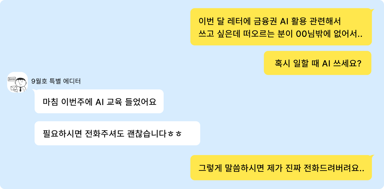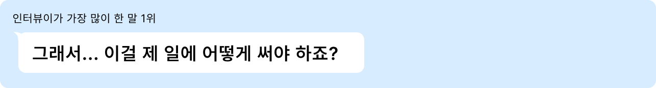 "AI 업무에 쓰시나요?" 라고 물으면 이상하게 목소리가 작아지시는 분들이 계셨는데요. 사내에서 공식적으로 AI를 활용하긴 어렵지만 조금씩 업무에 쓰고 계시는 분들이었습니다.