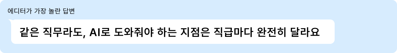 처음에 AI 활용 관련해서 실무자분들을 인터뷰하면서 중요하게 생각했던 것은 "직무별"로 다른 이야기를 들어본다는 점이었는데요. 인터뷰이들과 대화를 하면 할수록, “직급”이라는 단어가 계속 들렸어요. |