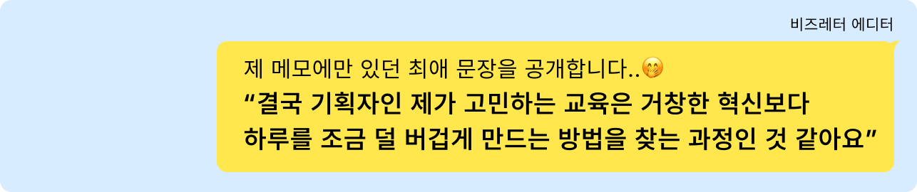 올해 인터뷰에서는 AI, 데이터, 전략 같은 단어도 많이 나왔지만 그보다 더 자주 들렸던 단어들이 있습니다. 업무, 시간, 야근, 이렇게 일상적인 단어들이요. 결국 우리가 고민하는 교육은 대단한 혁신이 아닌 하루를 좀 편하게 만들기 위함인 것이죠. |
