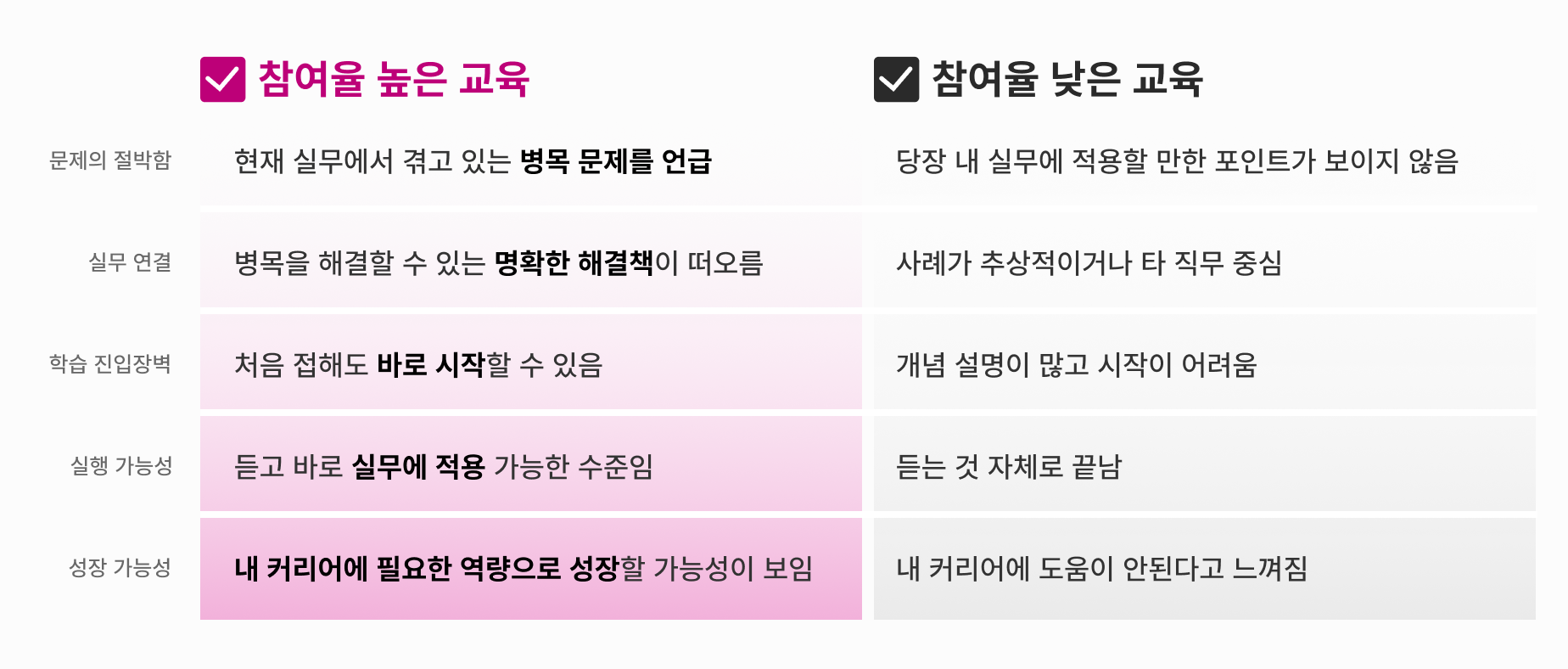 교육이 ‘듣는 것’에서 ‘내 커리어 성장의 도구’로 바뀌기 때문입니다. |