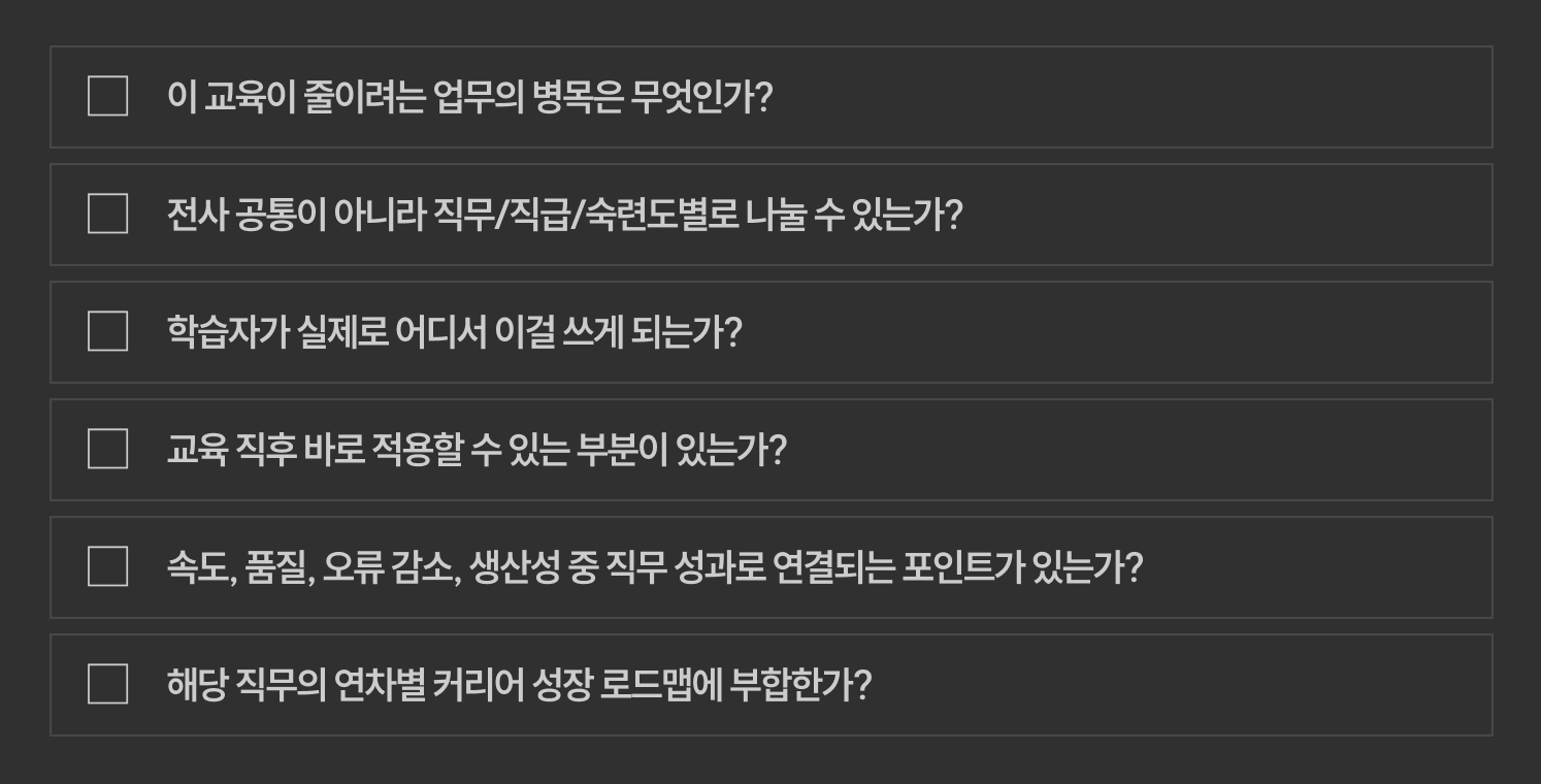 전사 공통 교육이 참여를 끌어내기 어려운 이유는 내용이 부족해서가 아니라 학습자 입장에서 “이게 내 일의 어떤 문제를 해결하지?”가 선명하지 않기 때문입니다.