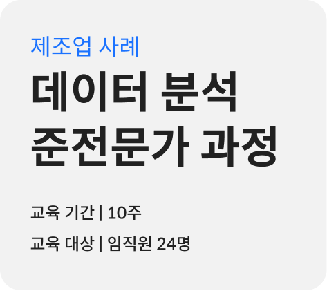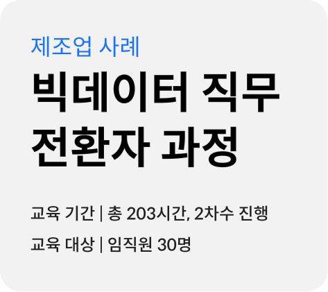 이번 웨비나는 총 4회로 구성되어 제조사, 금융사 등 기업들과 함께 진행한 직무전환 교육을 실제로 담당하셨던 매니저님들이 직접 발표를 맡아주셨습니다. 발표 내용에는 기업들이 교육을 기획하게 된 배경과 각 과정마다의 목표, 실제 커리큘럼, 결과물 그리고 이를 바탕으로 HRD 담당자님들께 드리는 제언까지 다양한 내용을 담아보았는데요. 이번 콘텐츠에선 4회차 웨비나의 내용을 소개해 드리겠습니다. 다른 미니 웨비나들의 발표 내용이 궁금하시다면, 아래에서 선택해 함께 읽어보세요:)