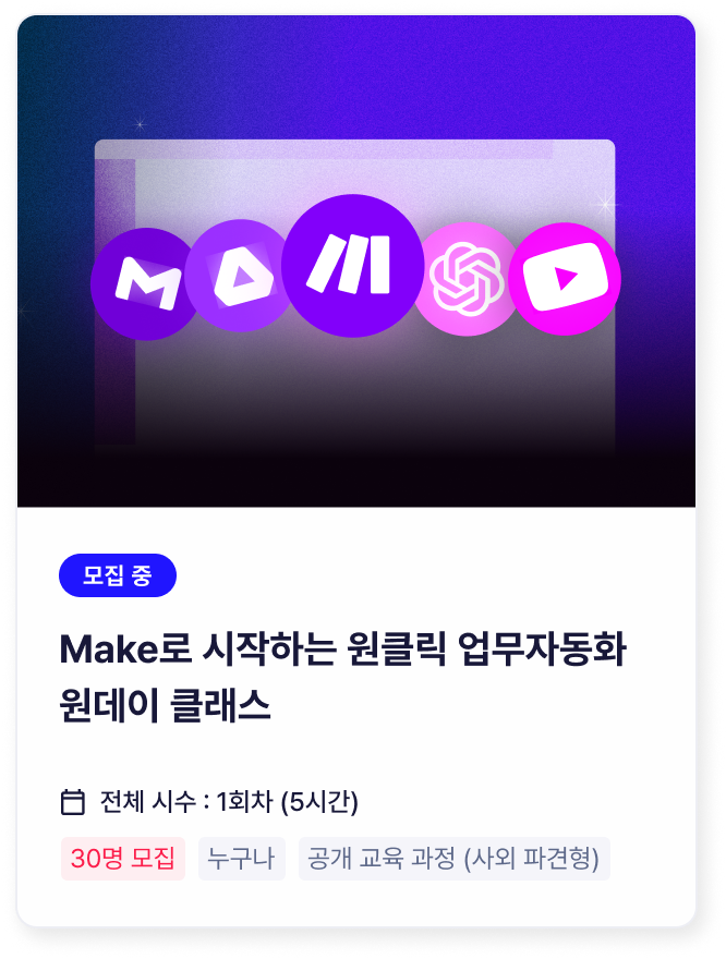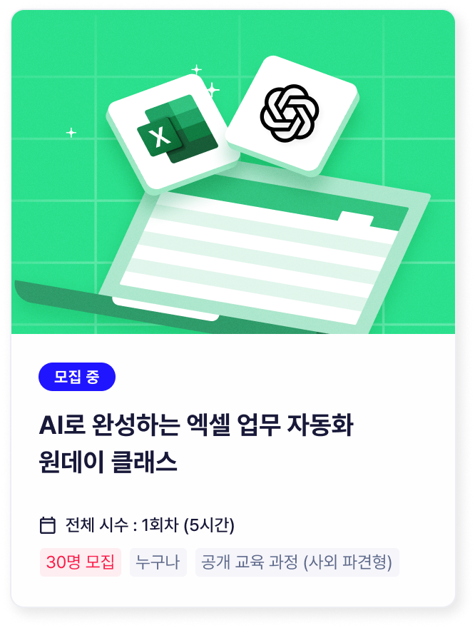 하루만에 활용 실습 결과물까지직무별로, 부서별로 생성형 AI를 활용하는 방법은 달라집니다. ChatGPT를 활용해 실제로 회사에서 하는 업무를 효율적으로 바꾸는 방법을 배웁니다. -