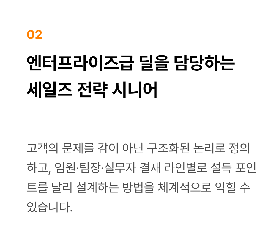 - 가격 방어, 레퍼런스 요구, 타사 비교 등 주요 거절 상황에 대한 논리적 대응 구조 설계