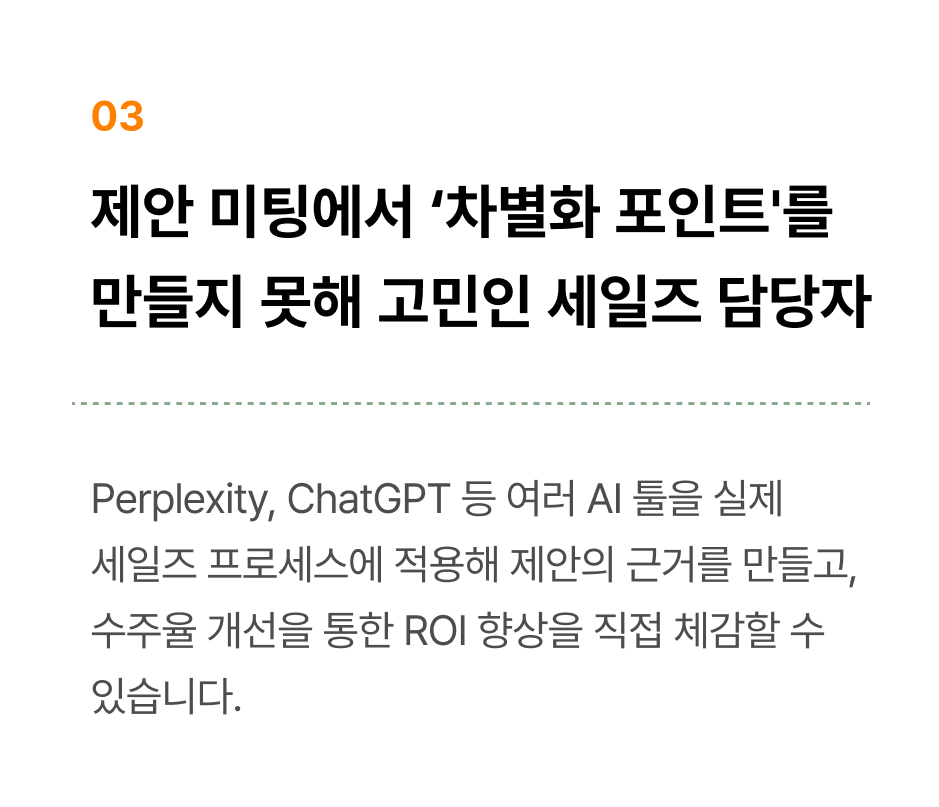 고객사 리서치부터 제안서 작성, 미팅 시뮬레이션까지 실제 B2B 세일즈 프로세스에 맞춘 AI 활용법을 다룹니다.