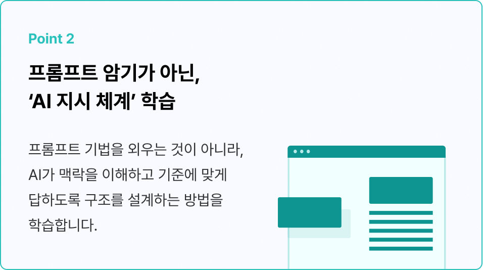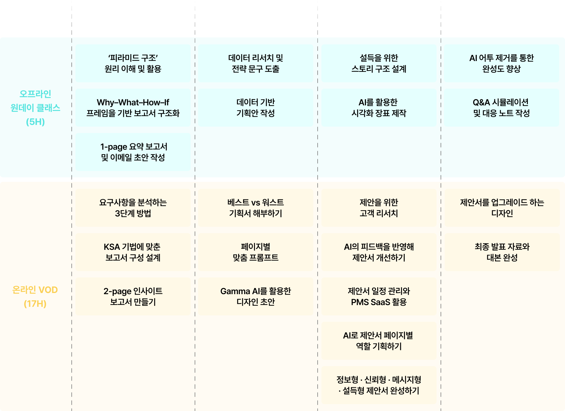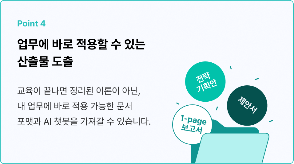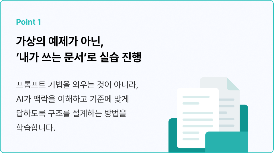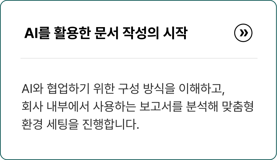 이번 과정은 AI를 단순한 문서 작성 도구가 아니라, 우리 회사의 기준과 업무 맥락을 학습한 문서 설계 파트너로 활용하는 방법에 집중합니다. 보고서·기획서·제안서 각각에 맞는 논리 구조를 설계하고, AI를 통해 업무 성과로 이어지는 문서 작성 방식을 직접 경험해 보시기 바랍니다.