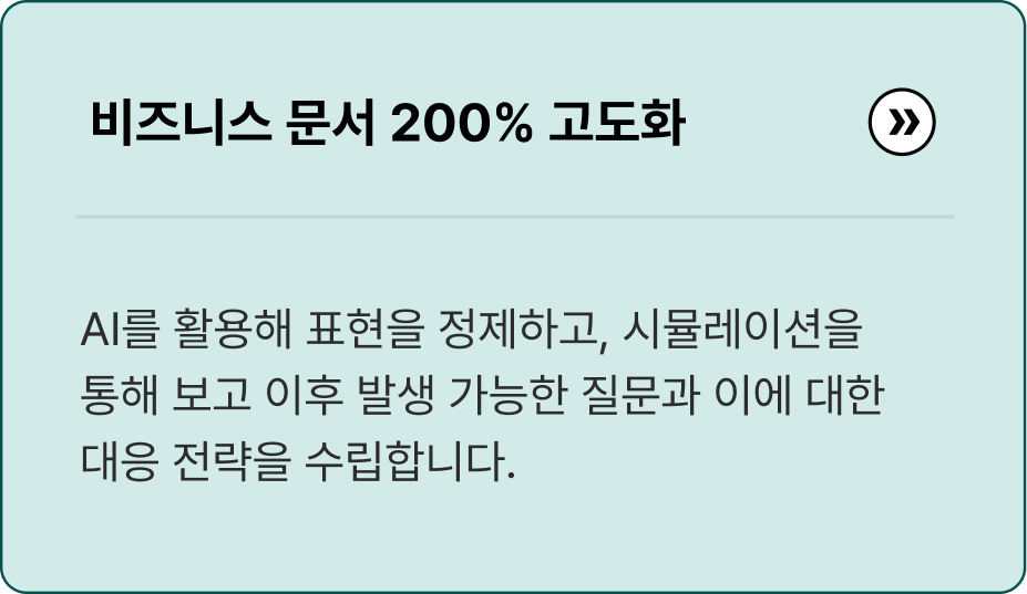 AI를 활용해 문서를 잘 쓰는 법이 아니라, 상사가 다시 묻지 않도록 의사결정을 한 번에 이끌어내는 비즈니스 문서 작성 역량을 훈련합니다.