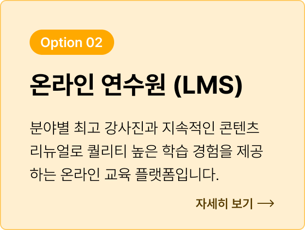 ※ 맞춤형 출강 교육 및 온라인 연수원 (LMS) 옵션 선택 시 선결제 금액의 10%가 추가된 금액 내에서 활용 가능합니다.