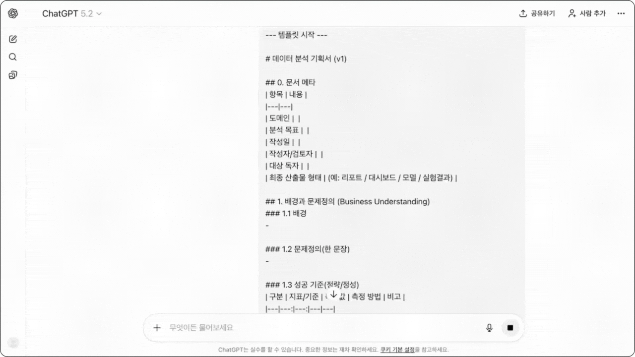 AI를 활용해 ‘문제 정의 및 가설 · 필요 데이터 · 분석 방향’을 담은 데이터 분석 기획 문서 작성