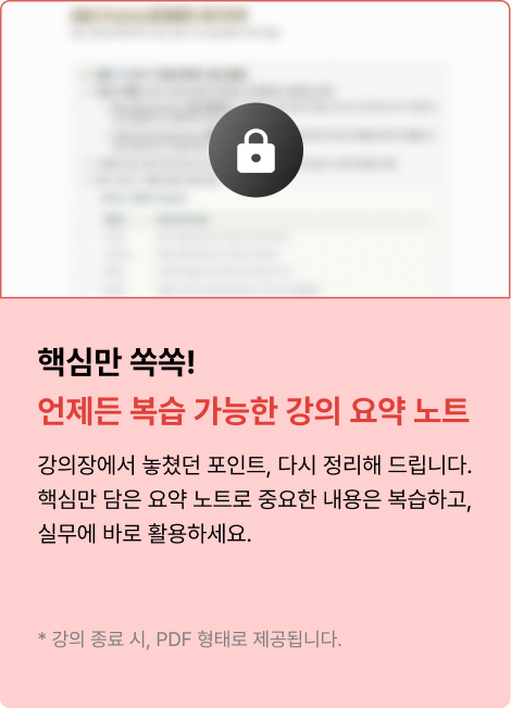 - 개강일 3 영업일 전, 이메일과 문자로 준비물 및 강의장 정보를 안내해 드릴 예정입니다.