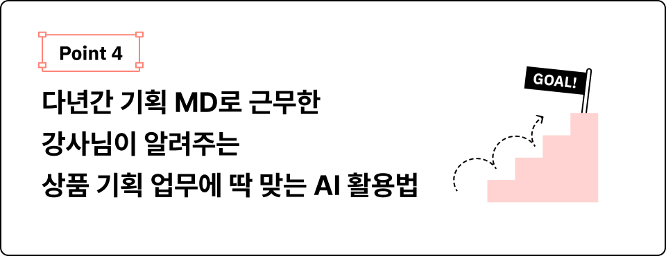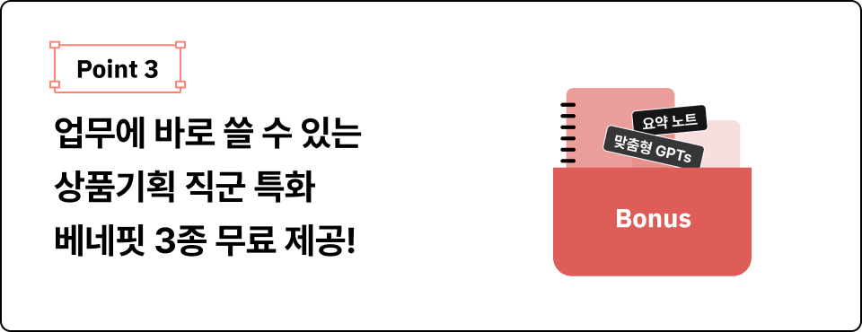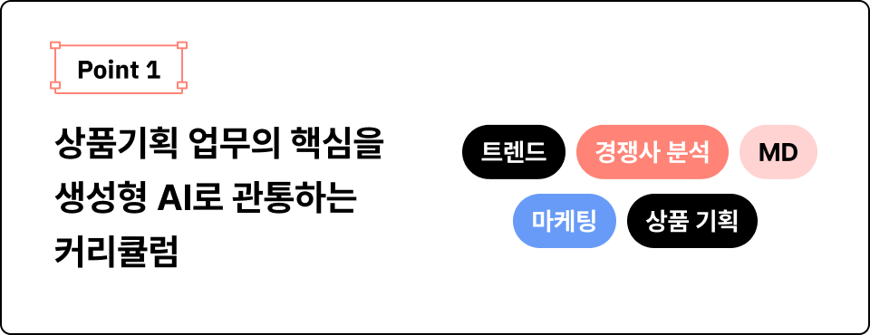 새로운 시장 기회 발견부터 상품 컨셉 구체화, 오퍼레이션 최적화까지. 상품 기획 업무에 필요한 AI 활용 방법을 학습합니다.