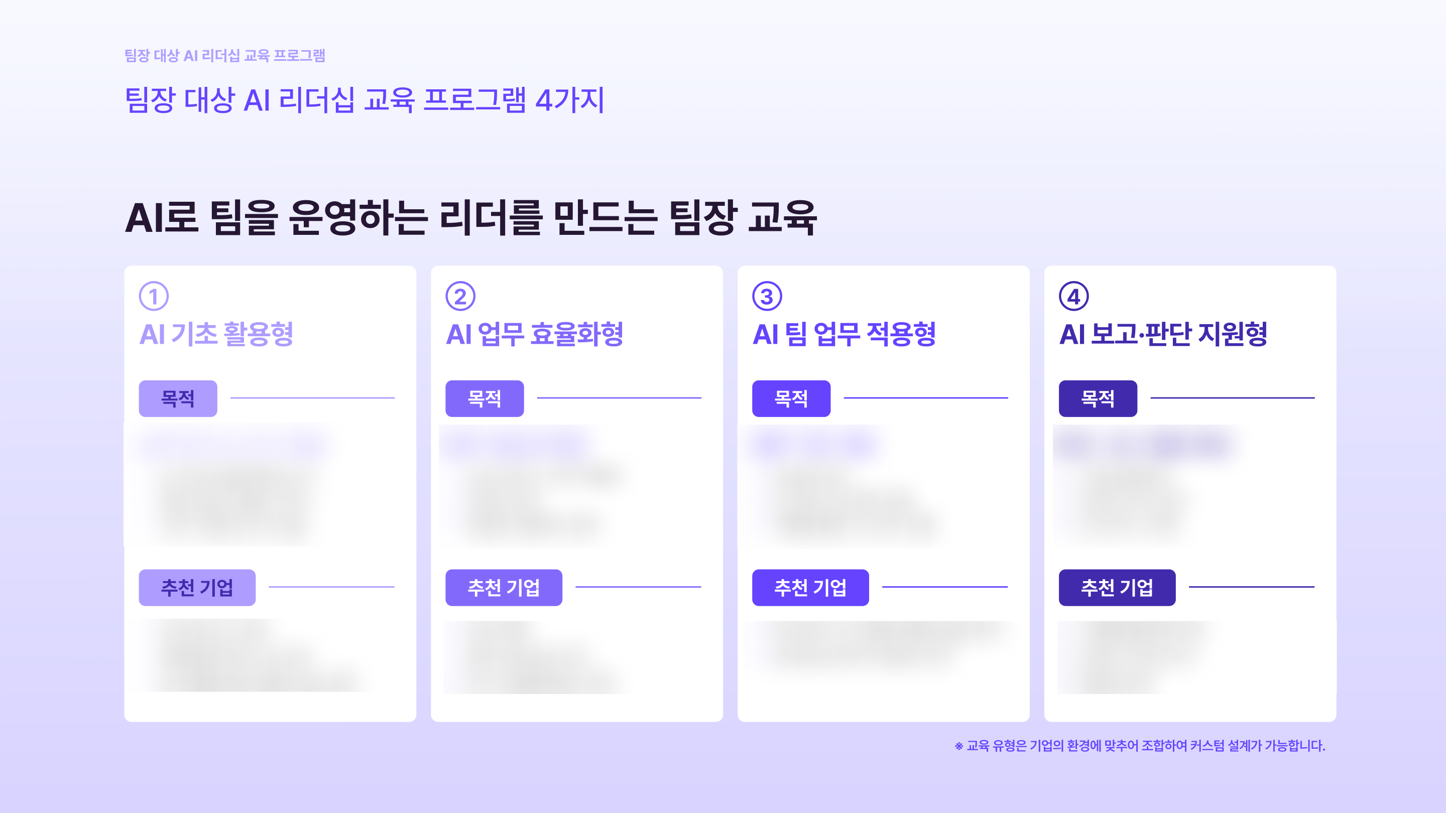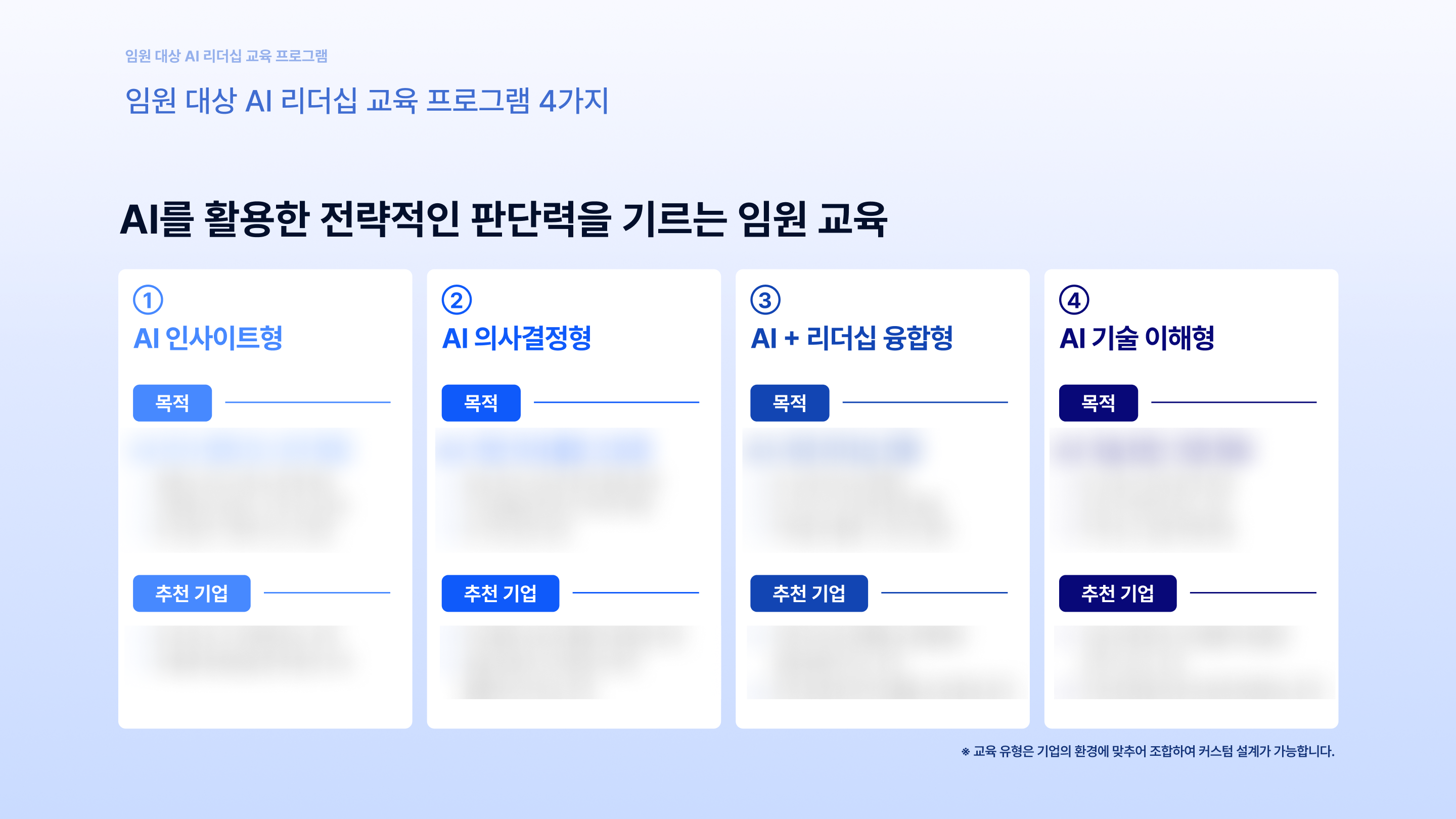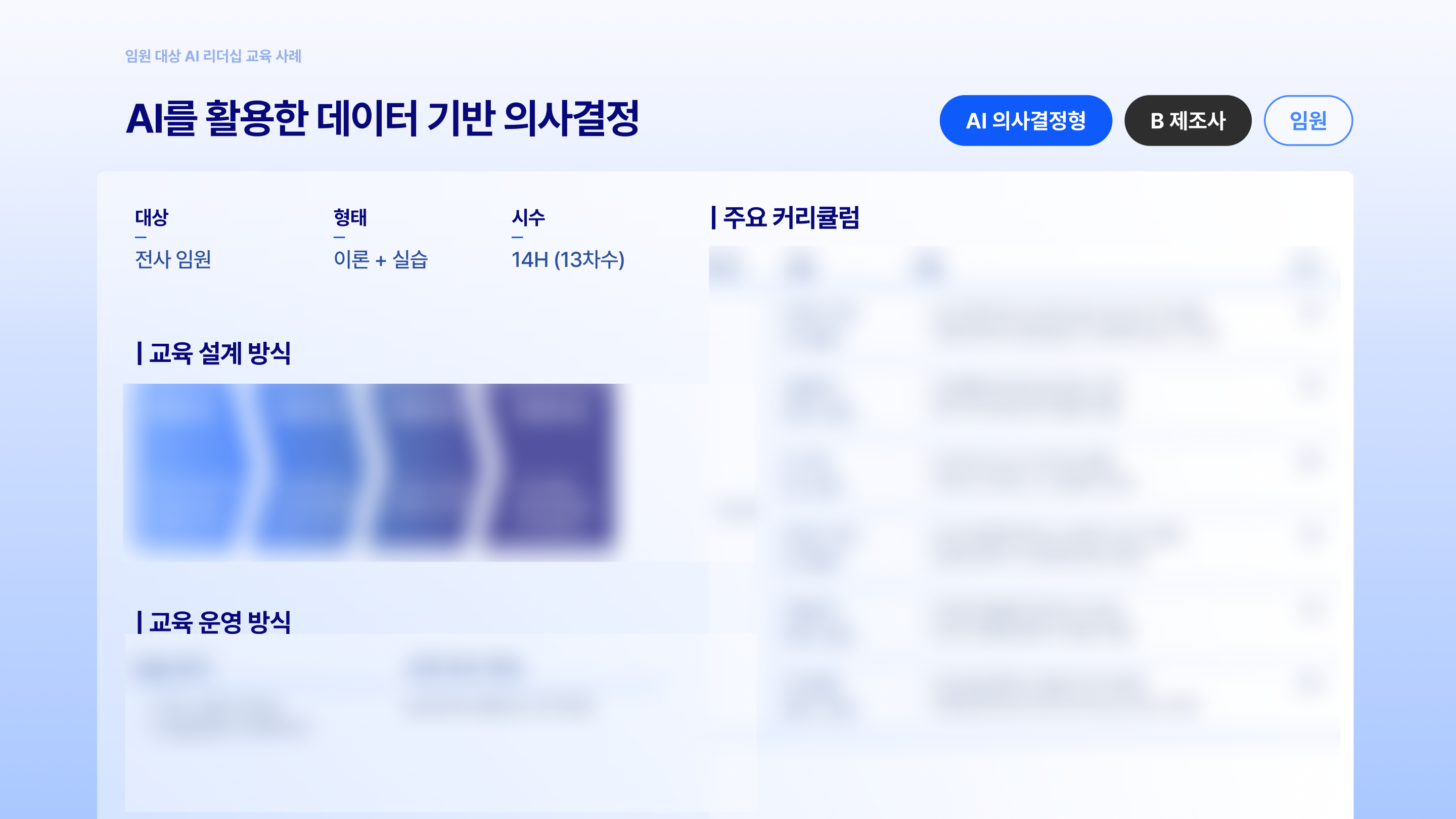 실제 타사에서 진행한 임원급/팀장급 대상 AI 리더십 교육 사례 8가지, 교육 설계 방법부터 주요 커리큘럼까지 모두 살펴보세요.